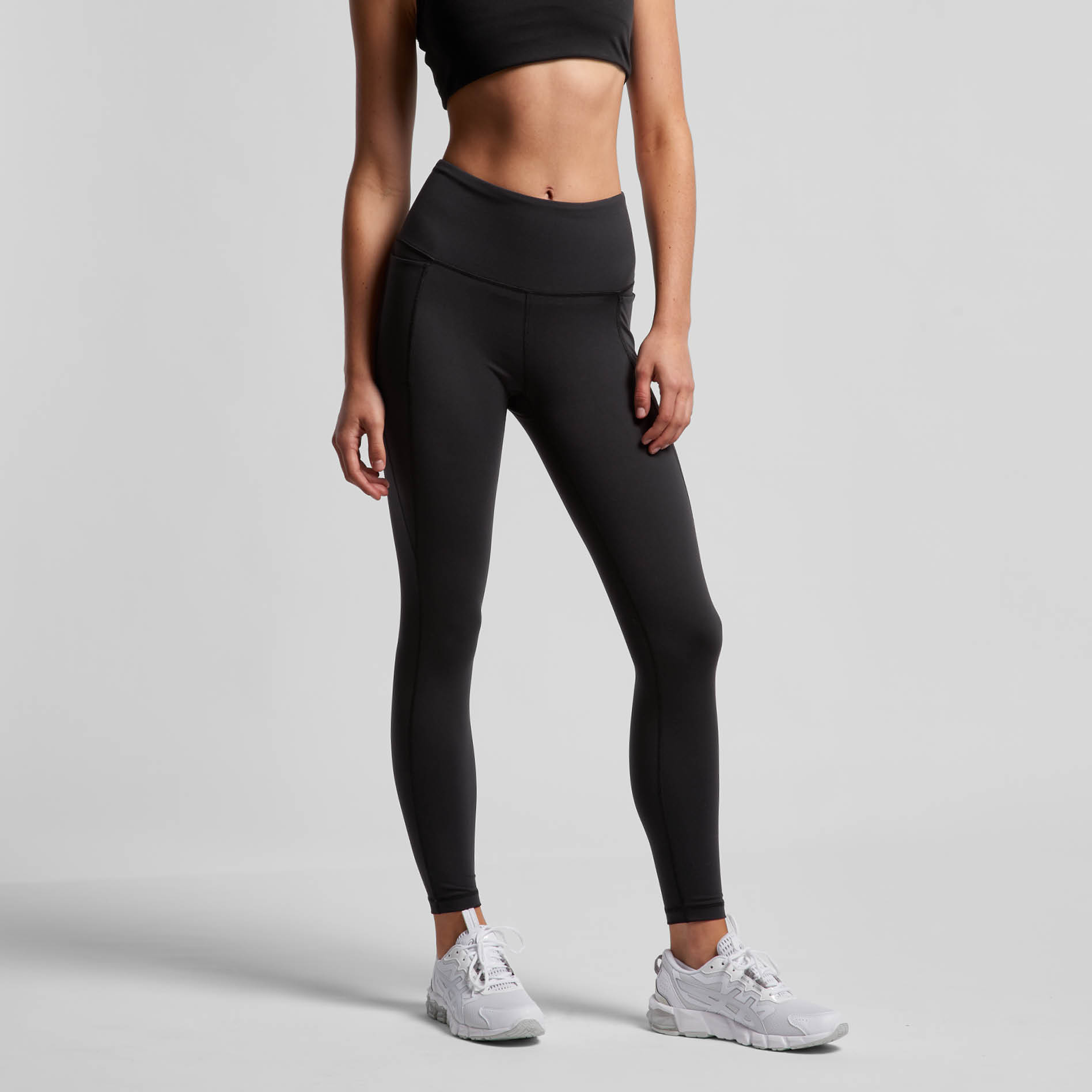 Matte finish, mid-thigh length, high waist, 2 x side pockets, contour seam detailing, moisture wicking, quick drying, high elastane content for resilience