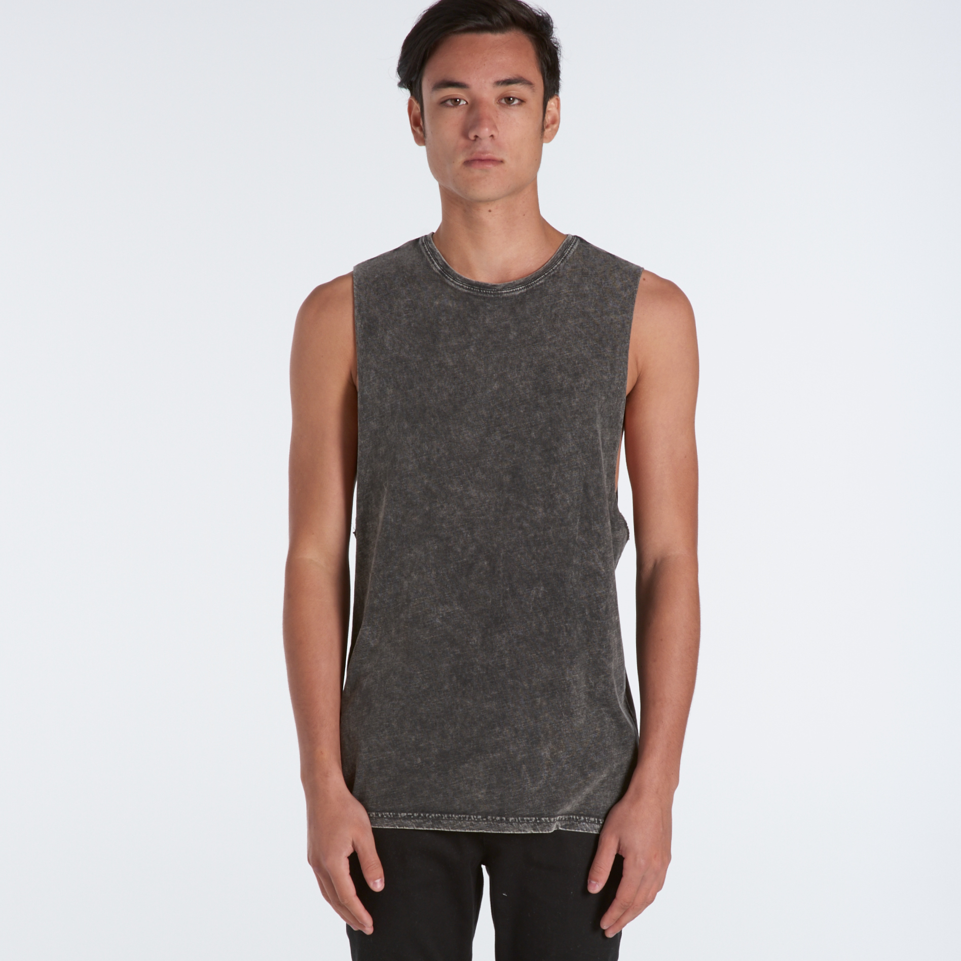 Sleeveless tank, raw armhole edges, stone wash finish with a worn look